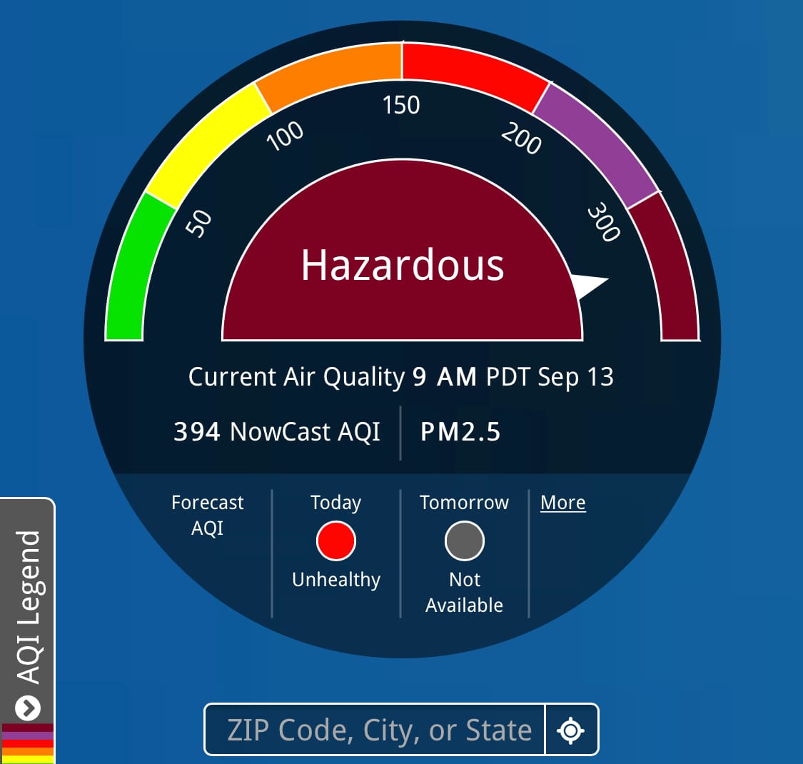 Here's a screenshot of AQI from the 13th, and it's still quite bad. I seem to recall it took a week or two before it finally rained and "washed away" the bad air after the high point. I remember at the time not going outside much during that time and not being able to exercise at all, while working from home and still largely house-bound thanks to covid.