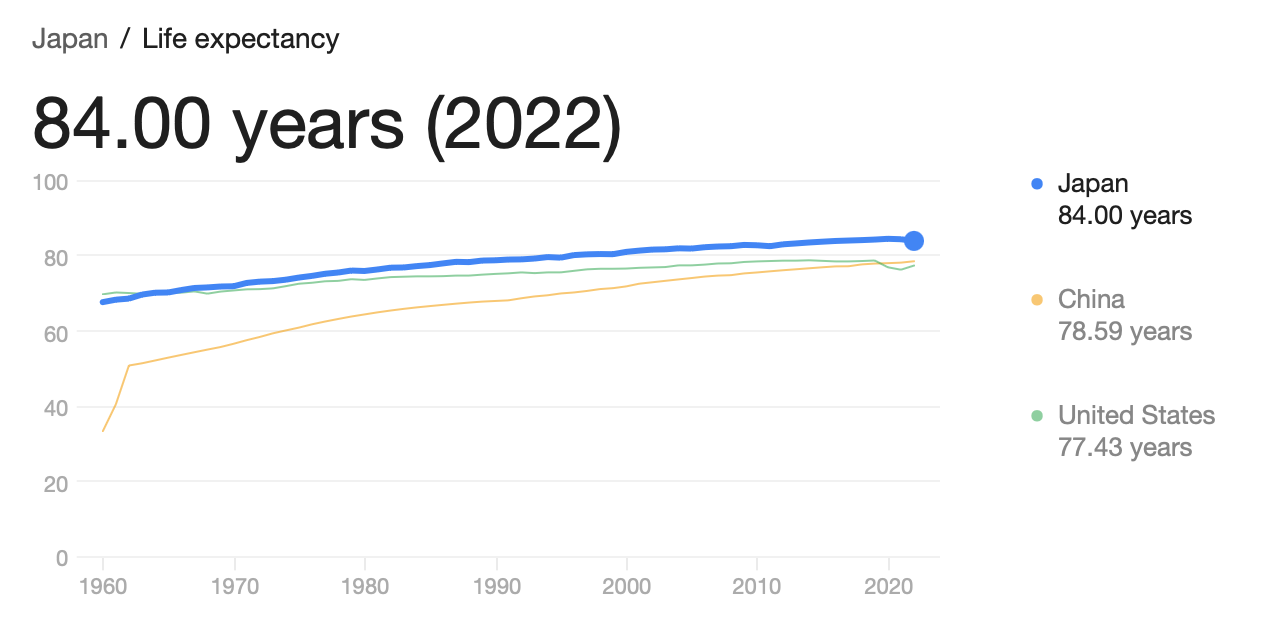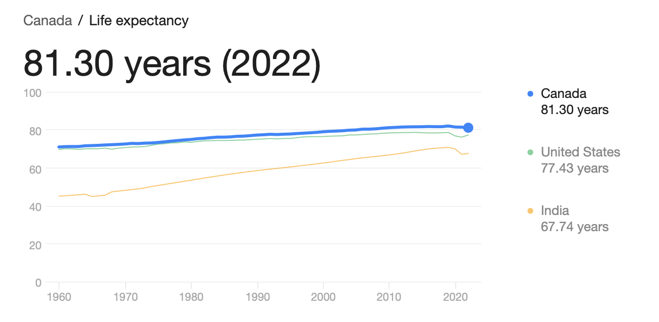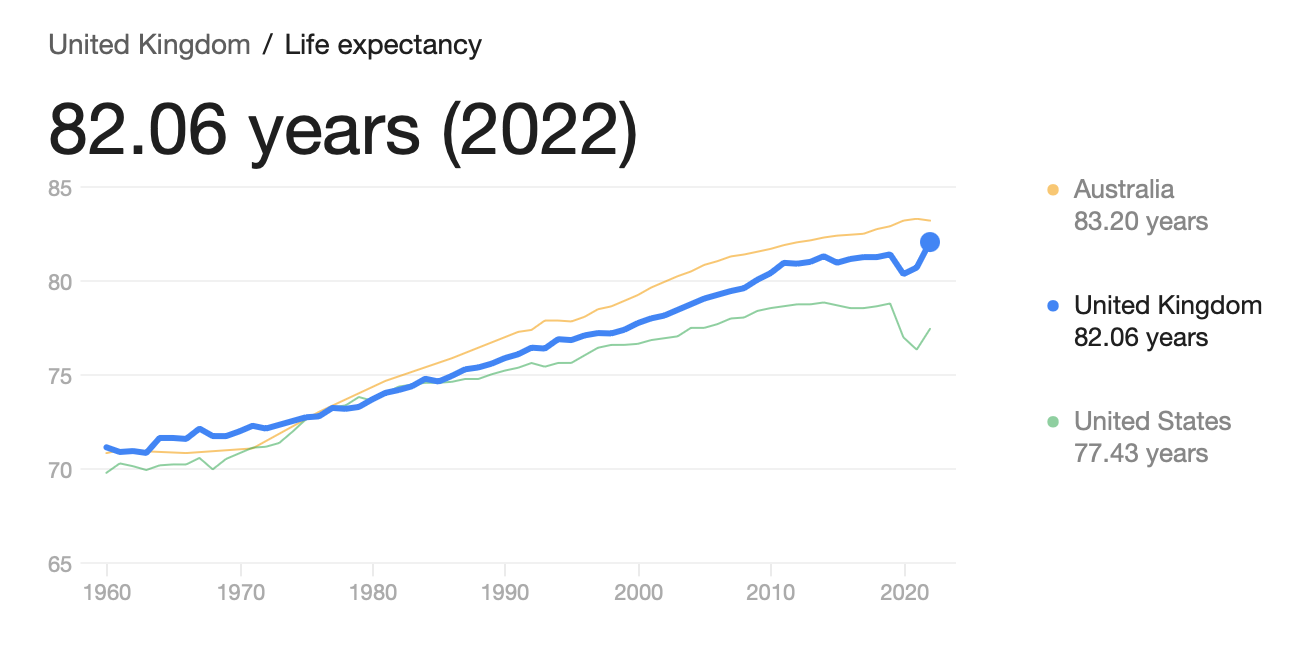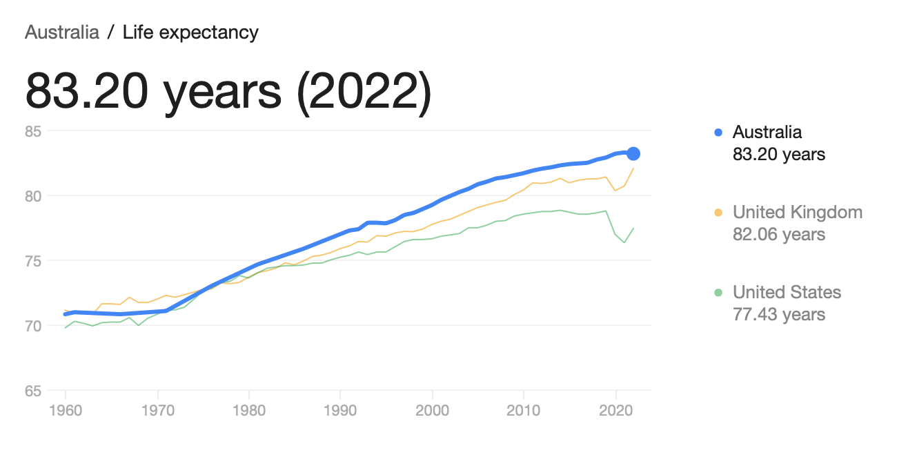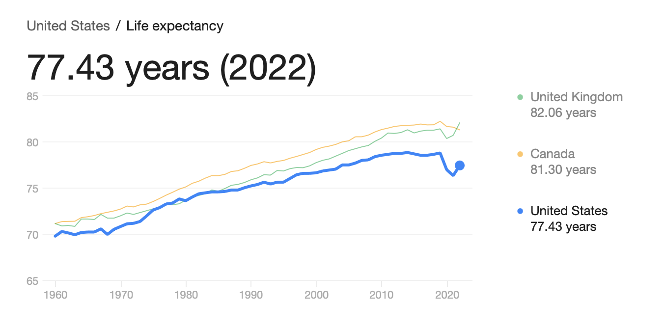 Canada is closest to the US in terms of similarity, and people there get nearly four additional years on this planet or over 5% longer lives than Americans. The UK, Australia and Japan increase lifespans even longer.