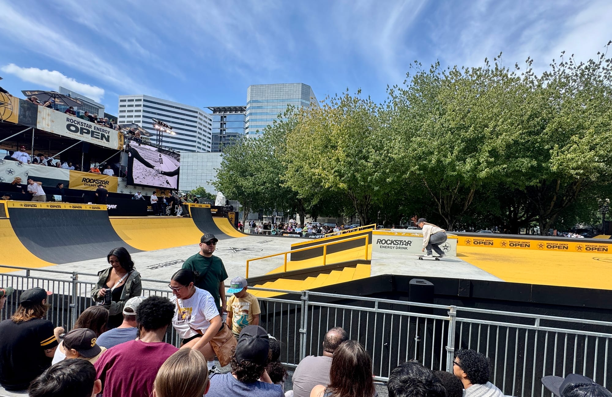 I was met with a giant festival like atmosphere, complete with tons of bleachers surrounding street, park, and skate bowl settings. There were also giant LCD screens like you'd see inside a baseball stadium, showing live video from inside the venues.