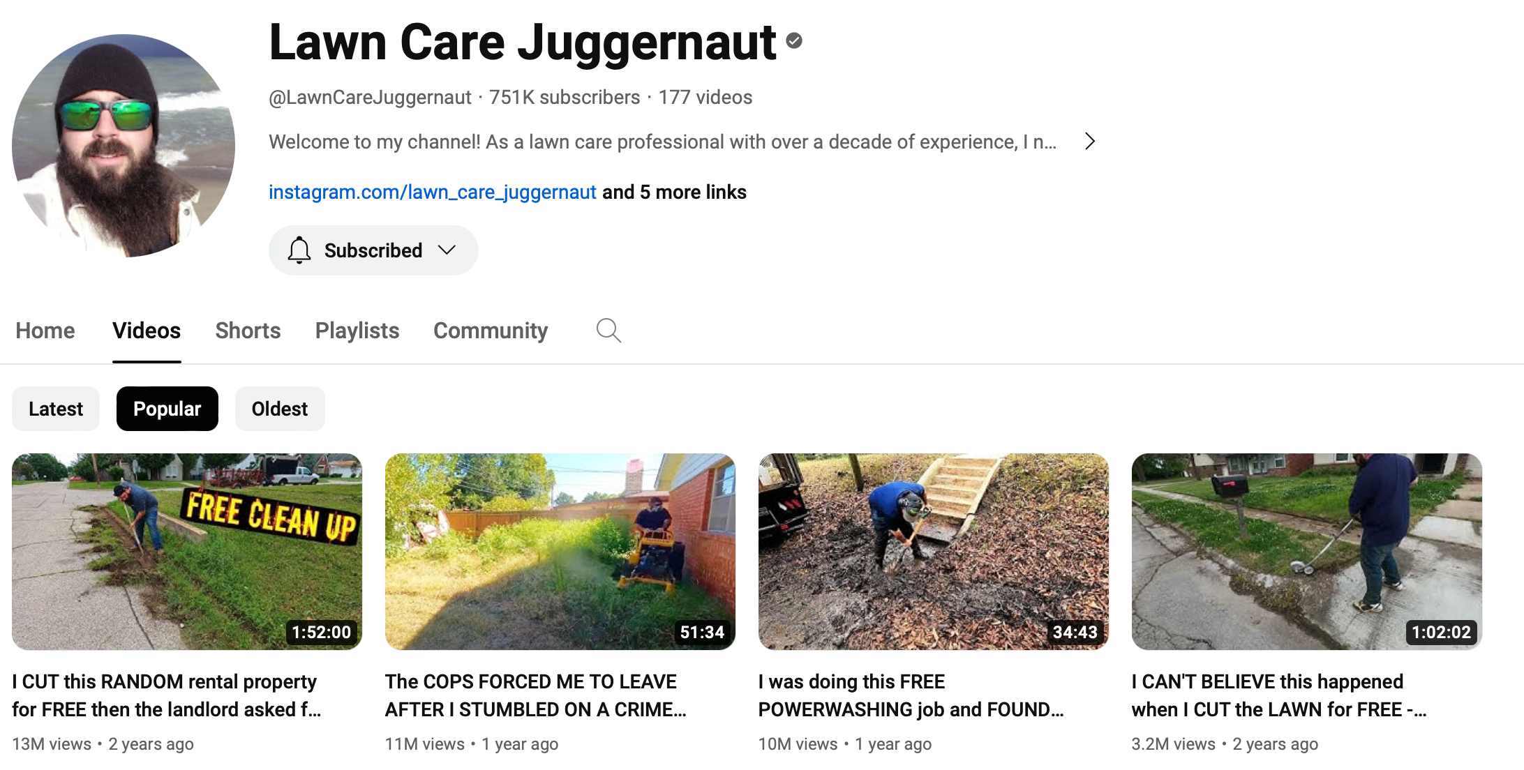 What’s funny is the trend I noticed in lawn care has spiraled into more guys doing a similar thing too. There’s The Lawncare Juggernaut who also finds the worst yards from the most down on their luck folks. He even runs The Boring Channel where he plays the same videos, but with less talking (his main channel has him talking over the grass cutting, sometimes telling you how to set up a lawn care business, sometimes he reads a favorite bible verse?). There’s SB Mowing too, and he even does power washing for free (another great subject for long, mesmerizing, satisfying videos that likely make a lot of ad revenue).