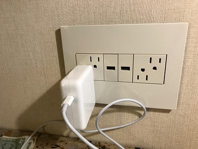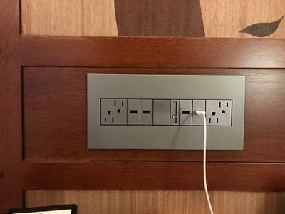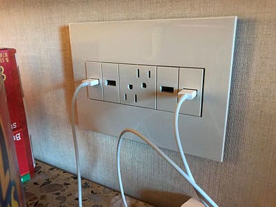 We had to endure some construction noise and dust at the Grand Californian where we stayed, but we got a brand new room that was well appointed. It had spacious new bathrooms with great showers. But the best feature was this hotel might possibly have the highest USB ports-to-square-footage ratio ever. Our room had something like ten or twelve USB ports all around the walls, which came in quite handy each night recharging devices.