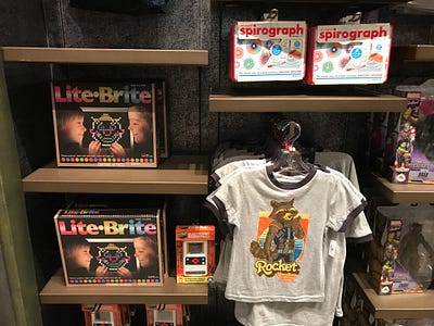 The first photo from the “exit through the gift shop” area for the new Guardians of the Galaxy ride. They not only brought together the obvious bunch of t-shirts and trinkets from the movie, they also had a wall of 1970s toys you could buy. There was Simon, Spirograph, Lite-Brite, and Mattel handheld games. They not only sourced stuff reminiscent of the movie’s own nostalgia, but they appear in boxes that looked period correct graphically. I don’t know if the California Adventure staff sourced them as-is or commissioned custom boxes, but they were pitch-perfect.