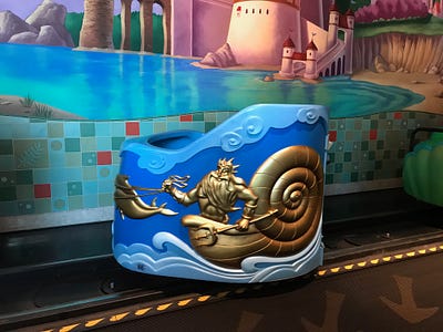 The second photo is what the accessible ride vehicle looks like in the Little Mermaid ride. It’s got a flat floor and wide entry to accommodate a variety of different wheelchairs, but instead of appearing as a simple utilitarian vehicle, they made it look even better and more embellished than the regular shell-shaped ride “doom buggies”.