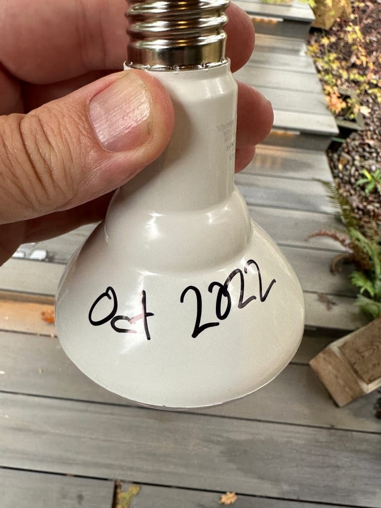 So I came up with a solution. Grab a sharpie, and put the date I replaced the light right on the light. Next time I pull out a dead bulb, I'll know how long it lasted and whether or not it was one of the existing 3 year old bulbs or a replacement I put in a few months ago.