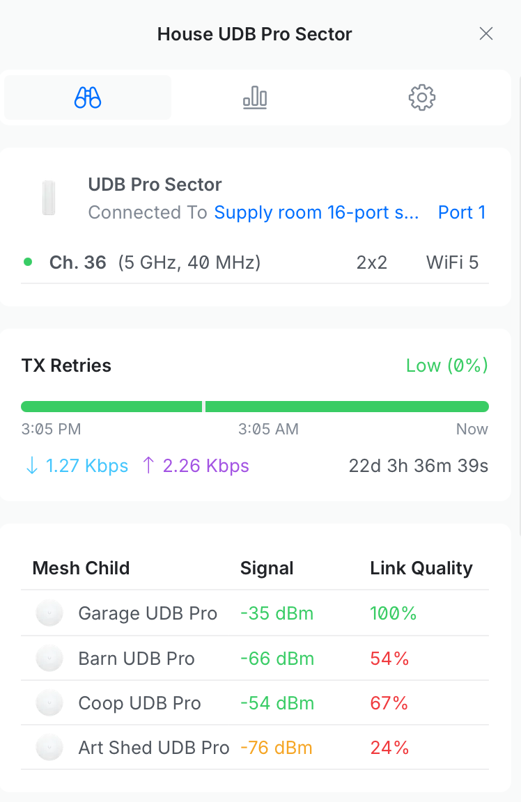 I will say the new devices have positives and negatives over the old ones. It's great they show up in my main UniFi console, but they offer only limited monitoring if you want to optimize them. Here's the details on the Device Bridge Sector that is attached to my house, showing each of the outbuilding connections.