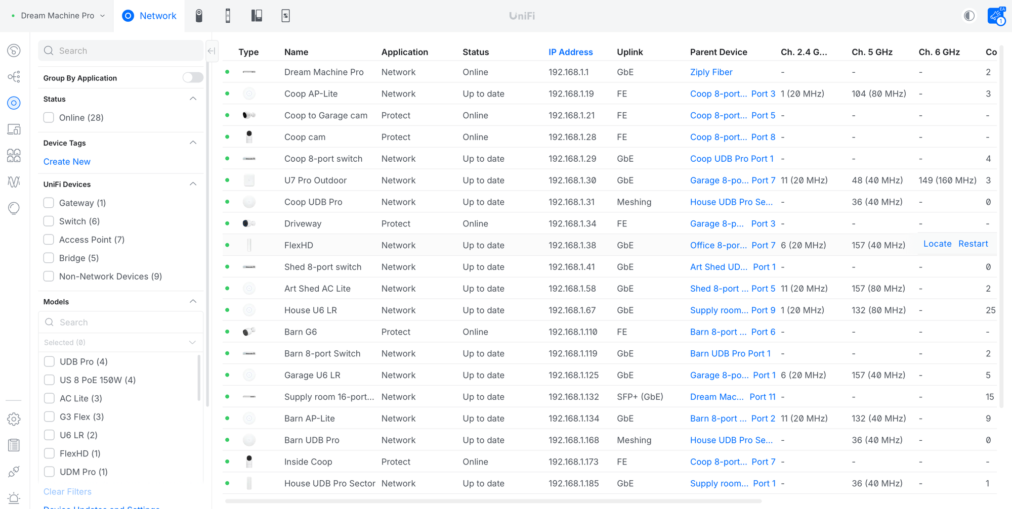 The new wireless gear finally integrates into the existing UniFi OS. I can now see all my wireless building points right next to the wifi points within each building, along with the network switches that control each of them, all in one screen.