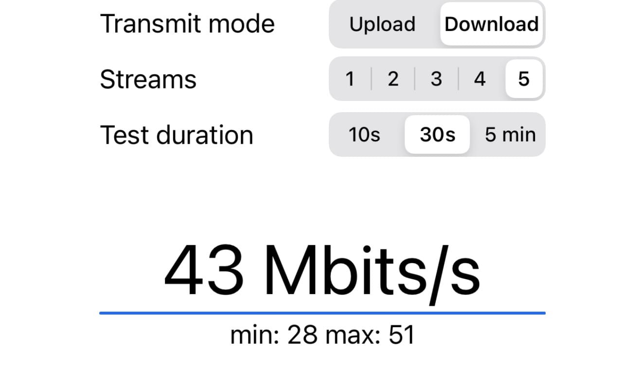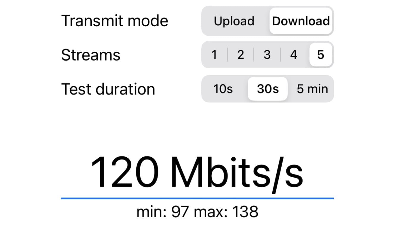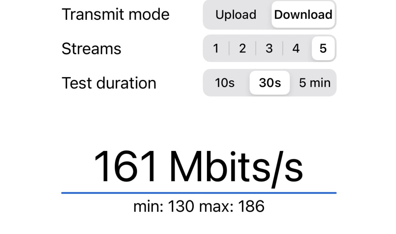 Here are the network speeds I get from different locations using iPerf3 talking to my main desktop Mac. The top left is inside my home office, so it represents optimal WiFi speed on the network. The 161Mbps result is from the garage with zero obstructions, the 88Mbps is the chicken coop, the barn gets 120Mbps, and the art shed in the forest gets 43Mbps.