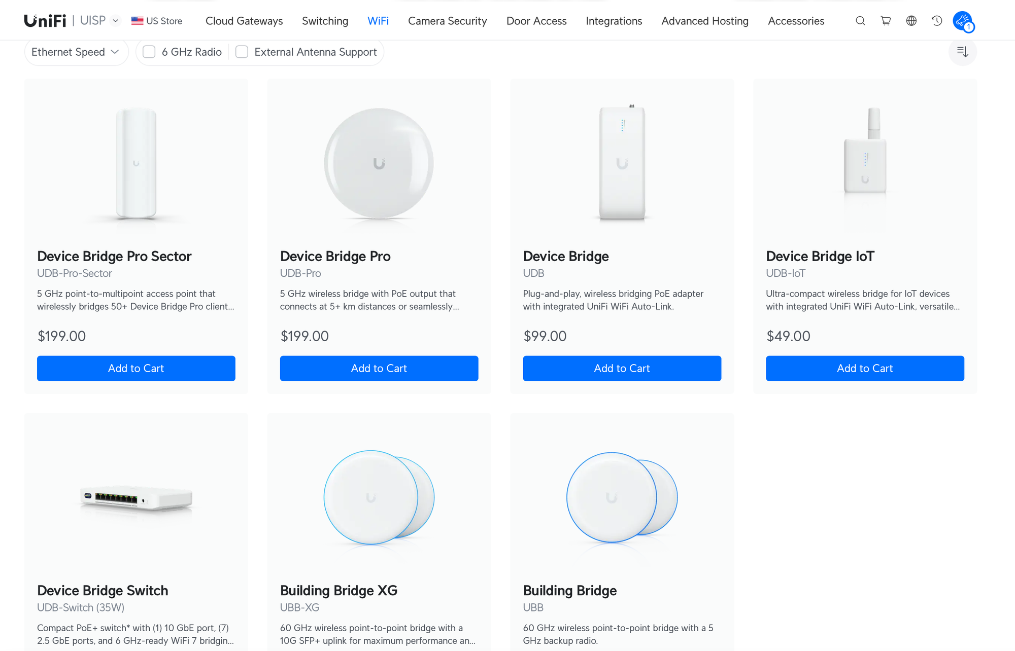 Thankfully, UniFi has wised up and they moved most of those devices to a page dedicated to professionals working for ISPs. Now, if you go to store.ui.com and look at bridging options for connections between buildings, they show just seven products to cover almost any home or small business need to connect networks between buildings wirelessly.