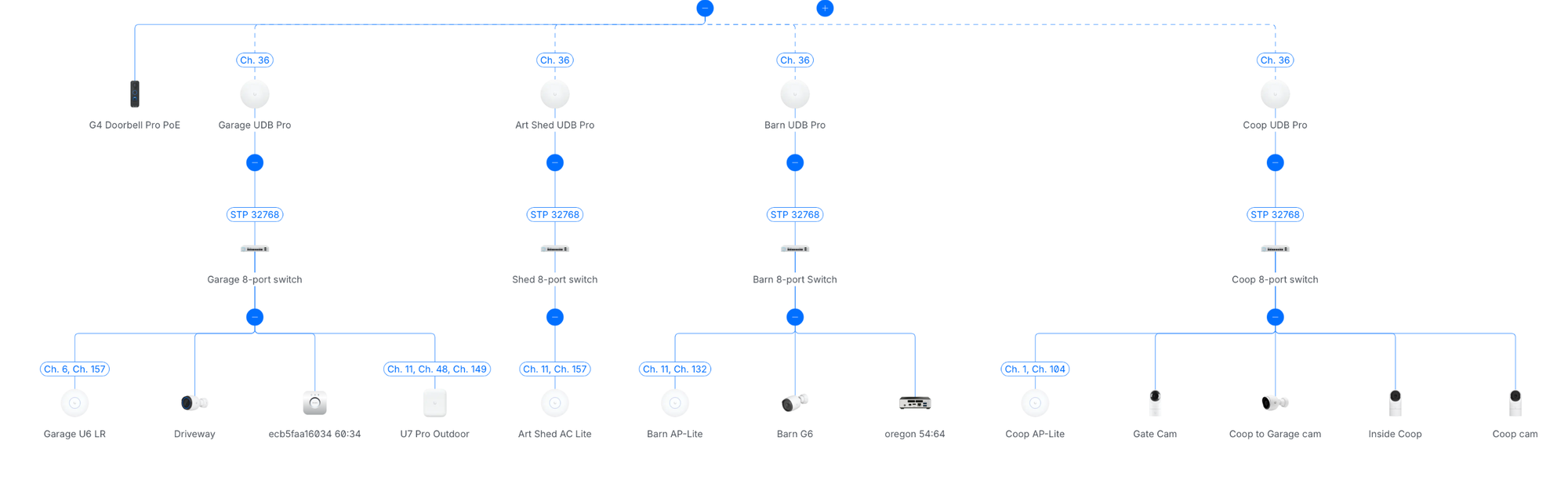Back in 2019, I wrote a post about how I set up a point-to-multi-point (PtMP) network to give every outbuilding around my house an internet connection. Each building also has wifi for when you are near them and everything is on the same local network so I can control lights, plugs, wall switches, and garage doors in each outbuilding.
