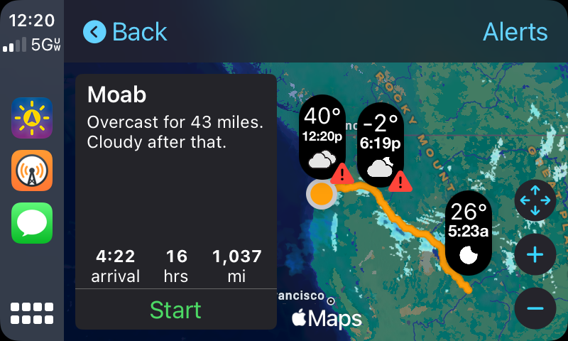 Above you'll see a screenshot of me putting in Moab, Utah as a destination and it highlights two mountain passes where there are current weather warnings, along with the predicted temps when I arrive at each place.