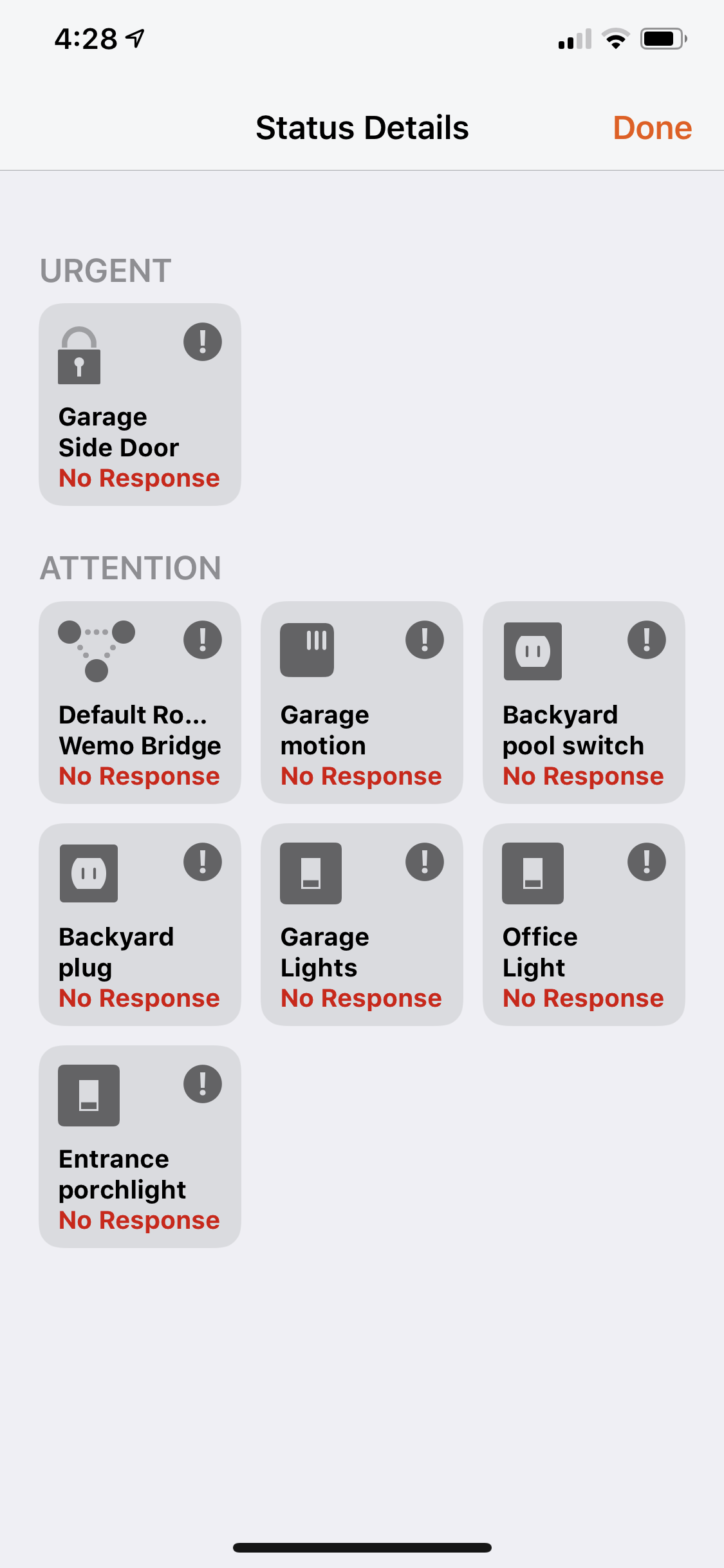 I don't mind that my love of internet-connected gadgets makes me a punchline on a podcast but just to give you an idea of what it's like, here's my Apple Home app currently showing a bunch of failed connections because my Wemo Bridge died for no reason last week. This also means none of these lights are automatically turning on or off any more.