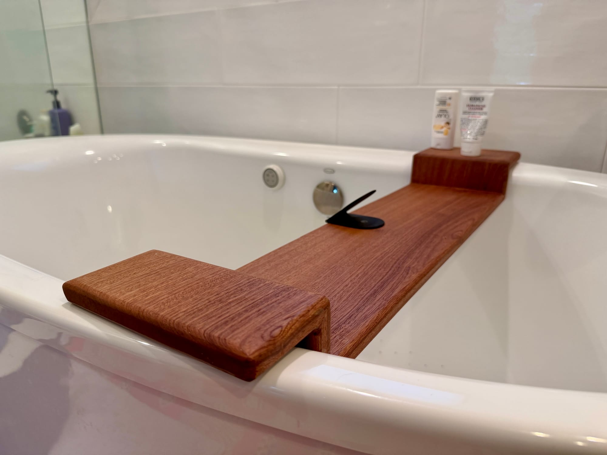 My first real project outside of my beginner woodworking class was following this video to make a custom shelf for our bathtub. My wife likes to read in the bath and I wanted to learn how to do mitered, waterfall corners and joinery with dowels. It's sapele wood (often called African Mahogany) and the grain runs continuously from one end to the other, all connected at every 45º joint which took a surprising amount of practice and patience to get all correct. Angles are hard!