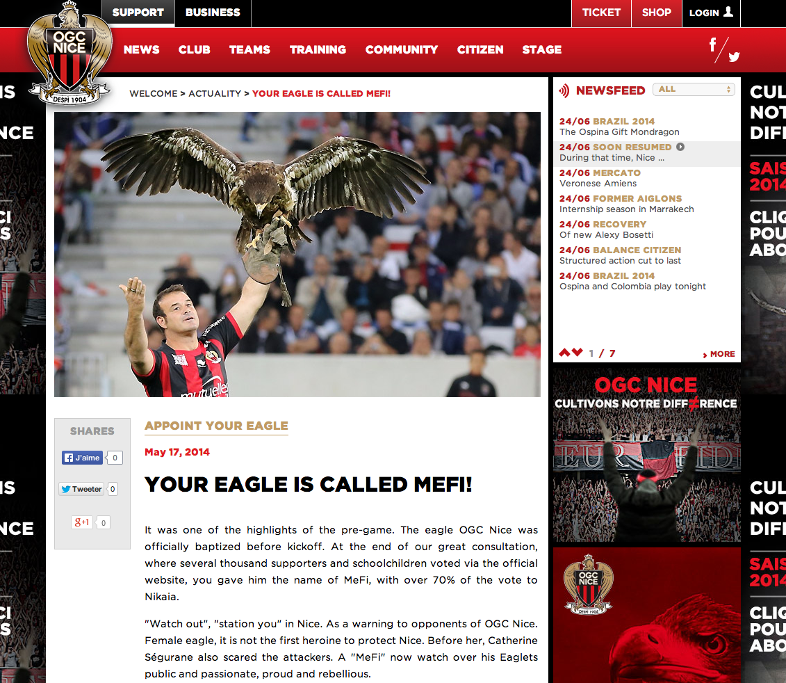It took a few more emails to paint a fuller picture. A top-tier French soccer team from Nice has a mascot that is an eagle. The team’s website threw an online contest to name the mascot and they came up with “mefi” which is also the short nickname for my site, MetaFilter. They wanted the @mefi account to represent the bird, and the idea sounded silly enough that I was intrigued.